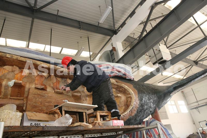 2019年12月24日,辽宁大连鸿峰生物多位标本制作师在制作抹香鲸“洋洋”塑化标本的车间忙碌。这个世界最大抹香鲸生物塑化标本的制作已经完成70%,明年年底前全部完工,运回江苏如东展出。