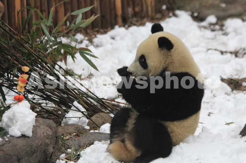 图片说明:12月25日,成都大熊猫繁育研究基地,大熊猫在雪地里享用工作人员准备的水果。