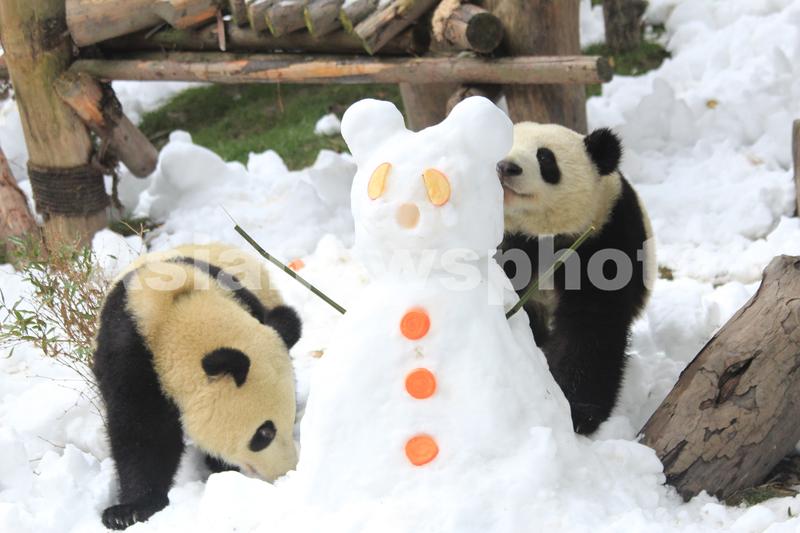 图片说明:12月25日,成都大熊猫繁育研究基地,大熊猫在雪人旁玩耍。(大熊猫基地供图)