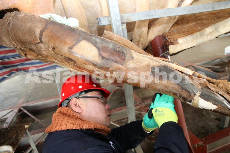 2019年12月24日,辽宁大连鸿峰生物多位标本制作师在制作抹香鲸“洋洋”塑化标本的车间忙碌。这个世界最大抹香鲸生物塑化标本的制作已经完成70%,明年年底前全部完工,运回江苏如东展出。