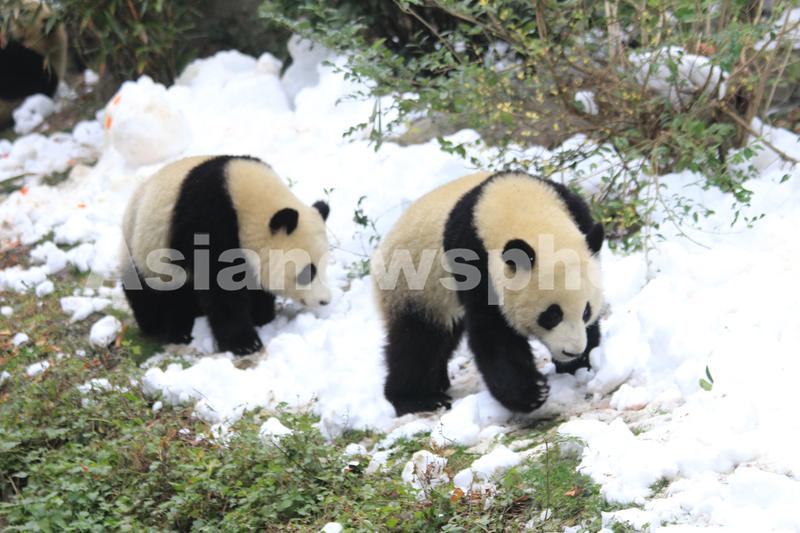 图片说明:12月25日,成都大熊猫繁育研究基地,大熊猫在雪地里玩耍。