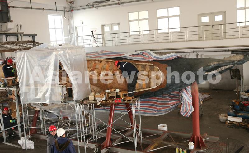 2019年12月24日,辽宁大连鸿峰生物多位标本制作师在制作抹香鲸“洋洋”塑化标本的车间忙碌。这个世界最大抹香鲸生物塑化标本的制作已经完成70%,明年年底前全部完工,运回江苏如东展出。
