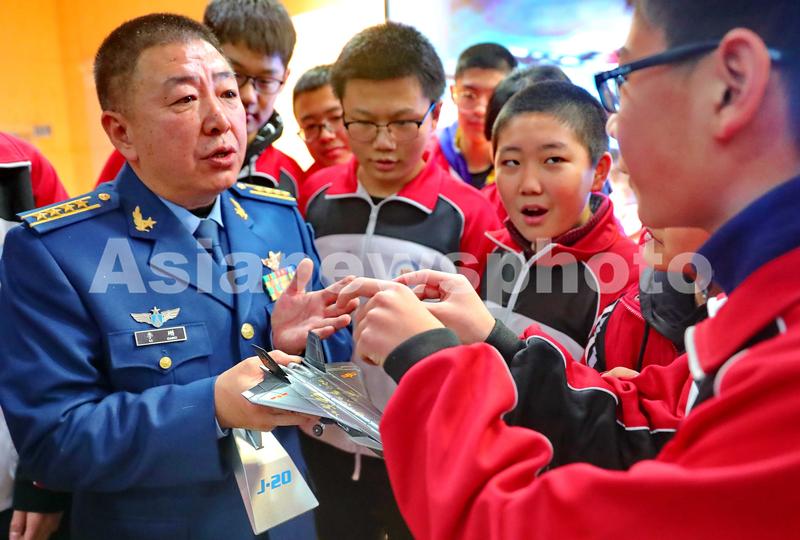 2019年12月30日,歼-20战机首飞试飞员李刚为秦皇岛市第七中学学生讲解国防教育知识。