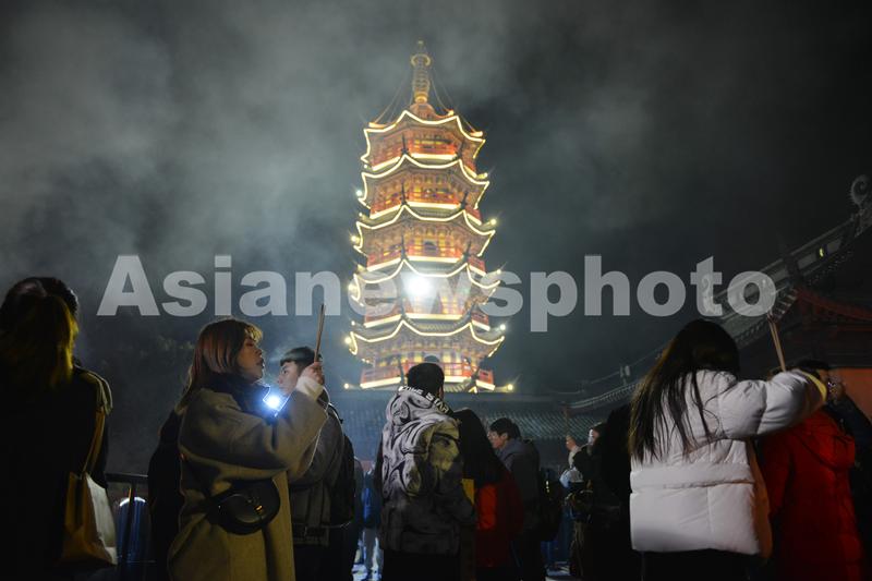 2019年12月31日晚,游客络绎不绝地来到南京鸡鸣寺内烧香、撞钟,参加跨年活动,迎接2020年的到来。