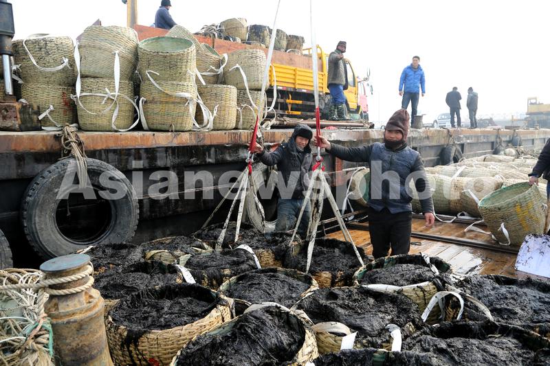 图片说明:2020年1月4日,连云港市连岛中心渔业码头,渔民将刚刚收割的新鲜条斑紫菜卸船装车,准备运往加工厂。
