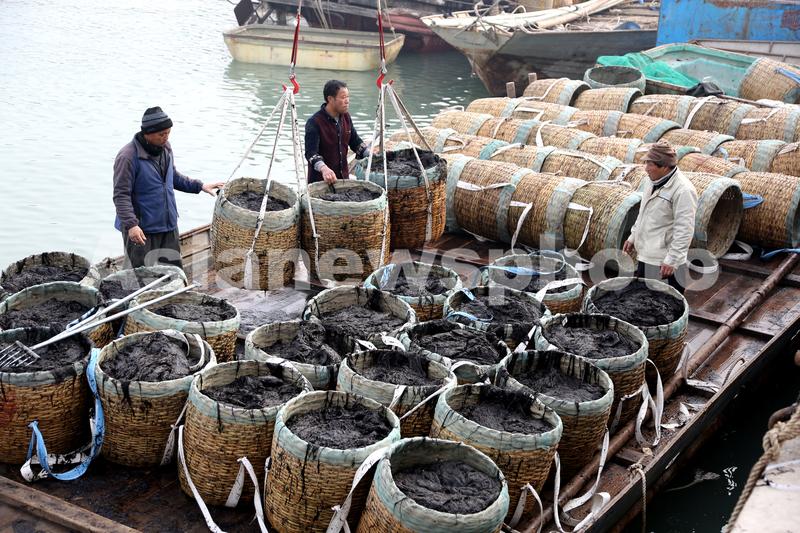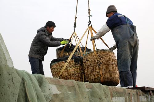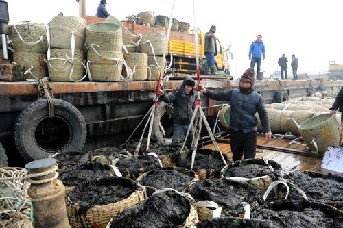 图片说明:2020年1月4日,连云港市连岛中心渔业码头,渔民将刚刚收割的新鲜条斑紫菜卸船装车,准备运往加工厂。