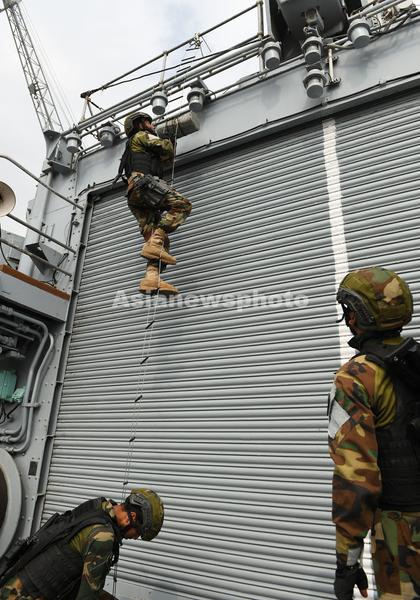 图片说明:当地时间1月7日,“海洋卫士-2020”中巴海上联合演习在巴基斯坦港口城市卡拉奇进行岸港训练。图为巴基斯坦海军特战队员登上目标船只,进行临检拿捕演练。