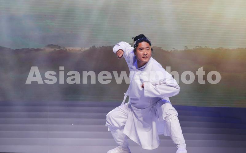 2020年1月16日,新闻发布会现场,武当山云飞道长在进行表演。