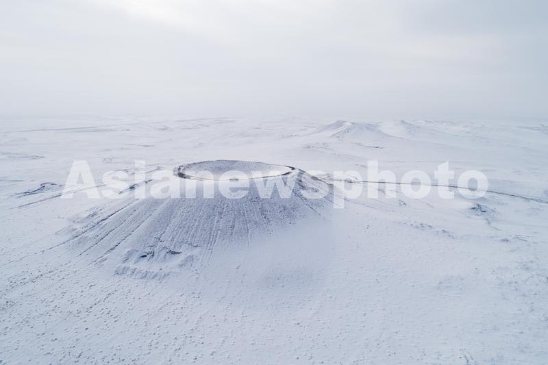 2020年1月16日,航拍乌兰哈达火山群。乌兰哈达火山群位于内蒙古自治区乌兰察布市察哈尔右翼后旗乌兰哈达苏木与白音察干镇之间,由30余座大小不一的火山组成,是内蒙古高原南缘发现的全新世(距今1万年)有过喷发的唯一火山群,分布面积约280平方公里。隆冬时节,乌兰哈达火山群银装素裹。
