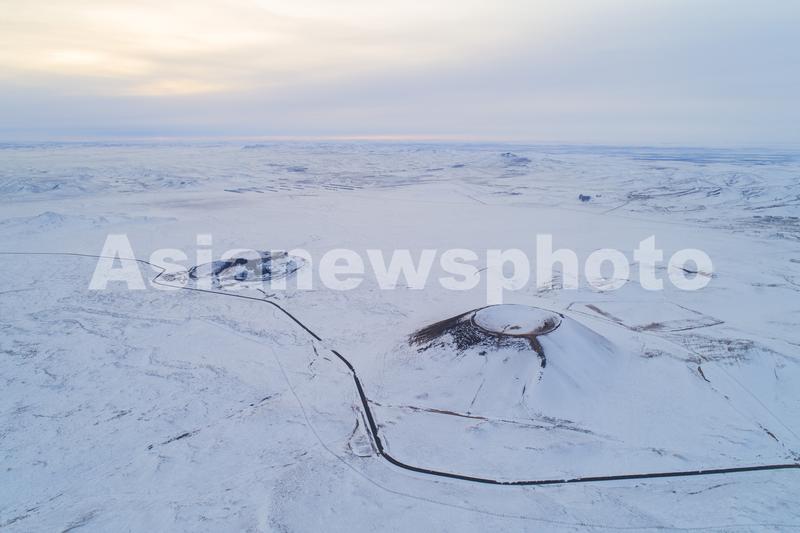 2020年1月16日,航拍乌兰哈达火山群。乌兰哈达火山群位于内蒙古自治区乌兰察布市察哈尔右翼后旗乌兰哈达苏木与白音察干镇之间,由30余座大小不一的火山组成,是内蒙古高原南缘发现的全新世(距今1万年)有过喷发的唯一火山群,分布面积约280平方公里。隆冬时节,乌兰哈达火山群银装素裹。