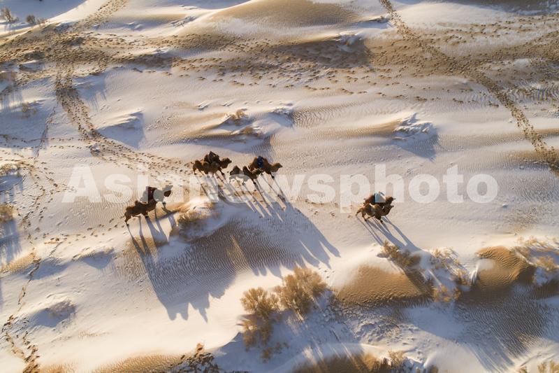 2019年12月29日冬日清晨 ,位于内蒙古巴彦淖尔市乌拉特后旗的巴音温都尔沙漠白雪皑皑、银装素裹,显得神奇而静谧,出牧的驼影与沙海构成一幅喜迎新年的民俗画卷。