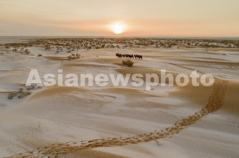 2019年12月29日冬日清晨 ,位于内蒙古巴彦淖尔市乌拉特后旗的巴音温都尔沙漠白雪皑皑、银装素裹,显得神奇而静谧,出牧的驼影与沙海构成一幅喜迎新年的民俗画卷。