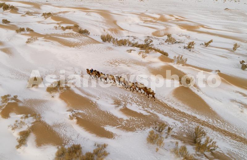 2019年12月29日冬日清晨 ,位于内蒙古巴彦淖尔市乌拉特后旗的巴音温都尔沙漠白雪皑皑、银装素裹,显得神奇而静谧,出牧的驼影与沙海构成一幅喜迎新年的民俗画卷。