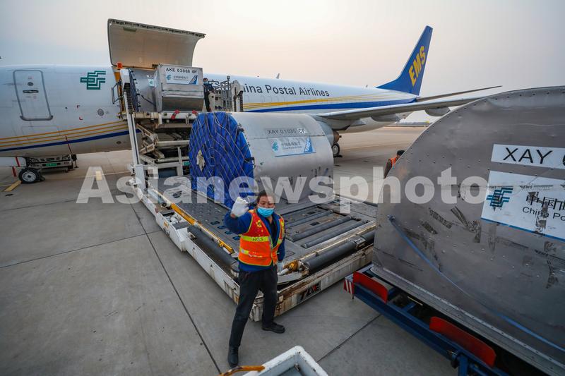 1月29日,武汉天河国际机场,工作人员在保障救援物资。