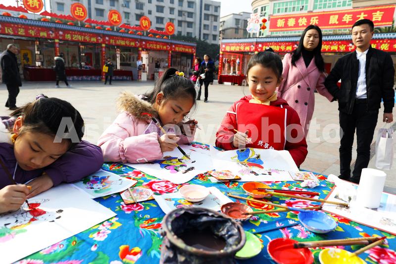 图片说明:1月19日,在四川省绵竹中心广场,小朋友们动手彩绘自己的年画。
