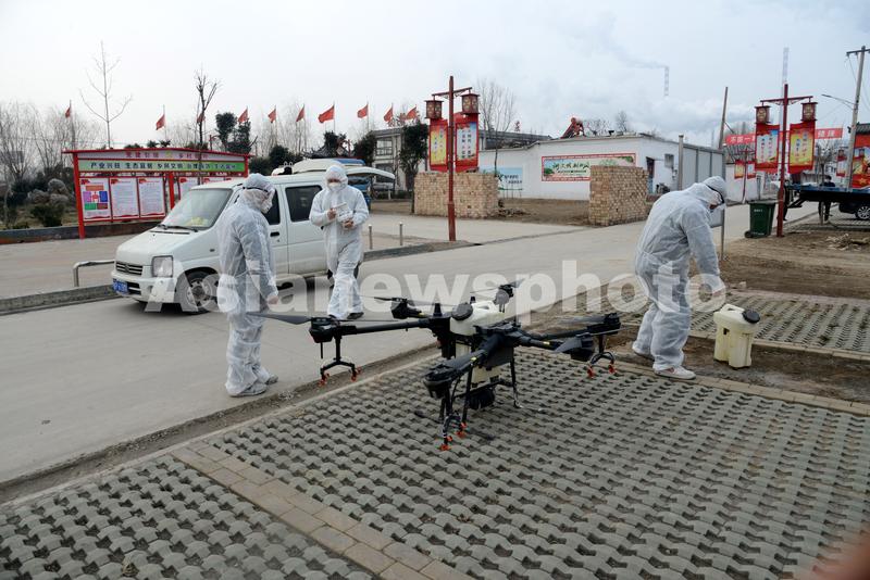 图片说明:2020年2月4日,山东省茌平区七彩公益青年志愿者防疫突击队在信发街道周庄村进行立体喷洒消毒作业。