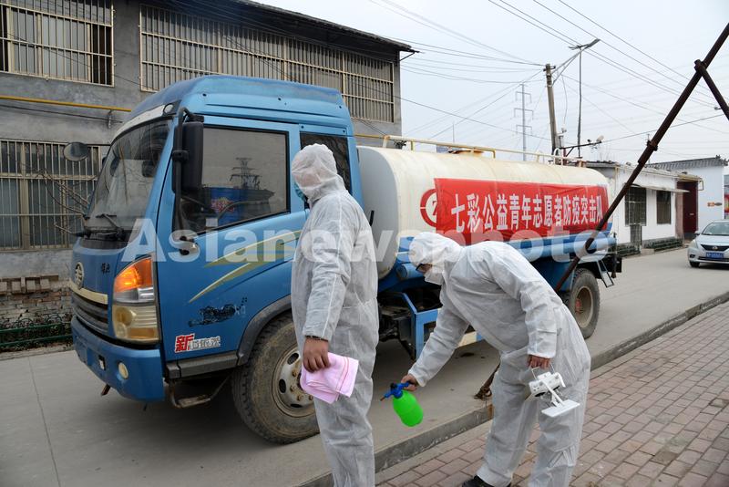 图片说明:2020年2月4日,山东省茌平区七彩公益青年志愿者防疫突击队在信发街道周庄村进行立体喷洒消毒作业。