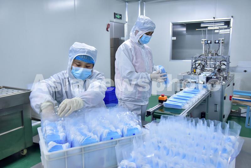 2020年2月10日,位于河北石家庄新乐市的河北康宁医疗器械有限公司的生产车间,工人们在加紧生产医用口罩。