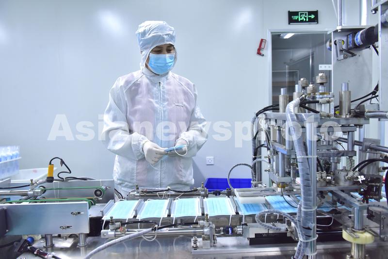 2020年2月10日,位于河北石家庄新乐市的河北康宁医疗器械有限公司的生产车间,工人们在加紧生产医用口罩。