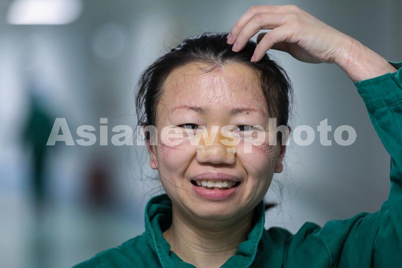 2020年2月17日下午,金银潭医院南二隔离病区,忙碌了一天的曹珊走出病房,口罩和防护装备在她的脸上留下一道道的勒痕。
