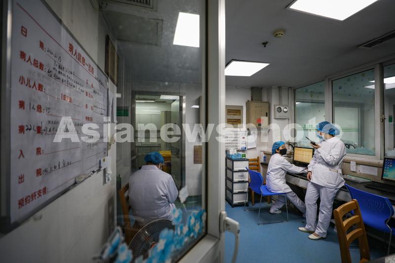 2020年2月16日下午,金银潭医院南二隔离病区,曹珊(右)在和同事沟通工作。