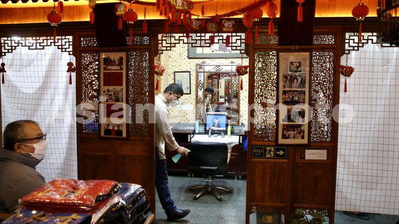 图片说明:顾客走后,师傅及时进行消毒。为防控疫情,理发店为顾客在独立房间进行剃头,每个房间特意加了布帘。