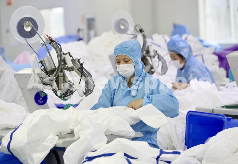 2020年2月14日,武汉市新洲区协卓卫生用品有限公司生产车间,工人在生产防疫物资如口罩、防护服等,以保障疫情防控物资生产供应。