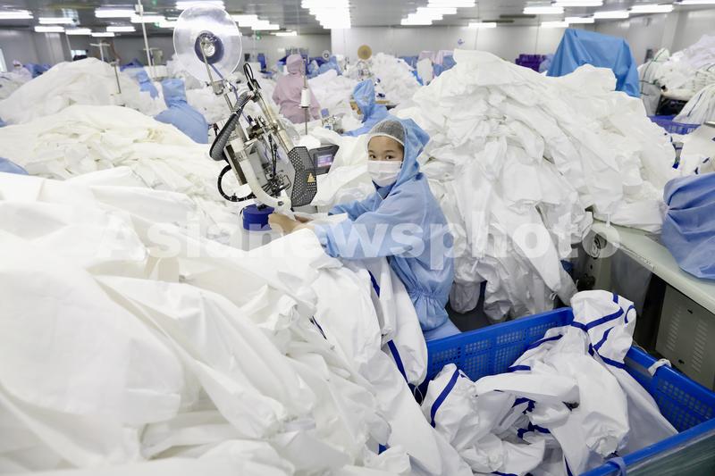 2020年2月14日,武汉市新洲区协卓卫生用品有限公司生产车间,工人在生产防疫物资如口罩、防护服等,以保障疫情防控物资生产供应。