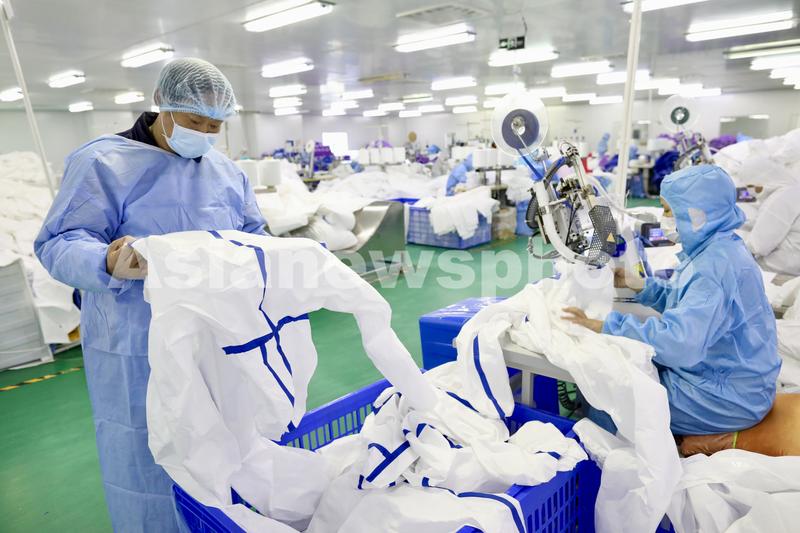 2020年2月14日,武汉市新洲区协卓卫生用品有限公司生产车间,工人在生产防疫物资如口罩、防护服等,以保障疫情防控物资生产供应。