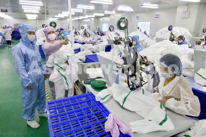 2020年2月14日,武汉市新洲区协卓卫生用品有限公司生产车间,工人在生产防疫物资如口罩、防护服等,以保障疫情防控物资生产供应。
