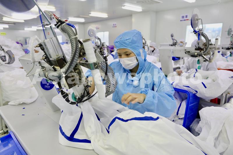 2020年2月14日,武汉市新洲区协卓卫生用品有限公司生产车间,工人在生产防疫物资如口罩、防护服等,以保障疫情防控物资生产供应。