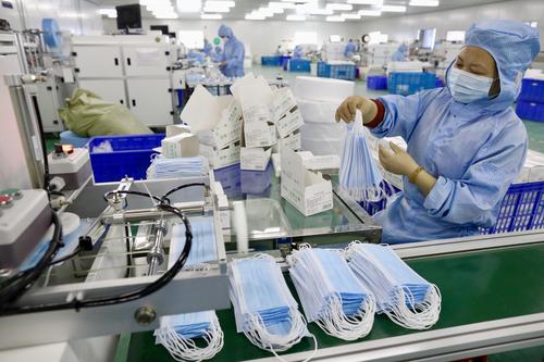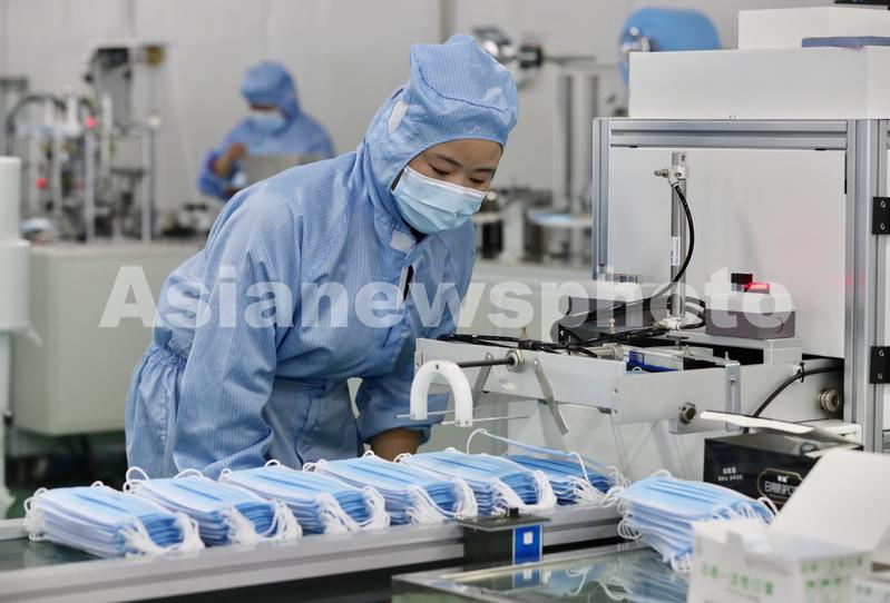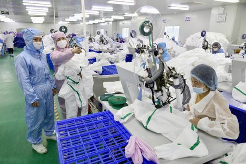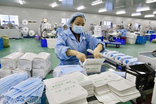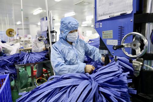 2020年2月14日,武汉市新洲区协卓卫生用品有限公司生产车间,工人在生产防疫物资如口罩、防护服等,以保障疫情防控物资生产供应。