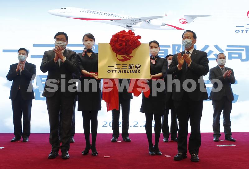 上海市副市长汤志平(前左)、东航集团董事长刘绍勇(前右)为一二三航空有限公司揭牌。