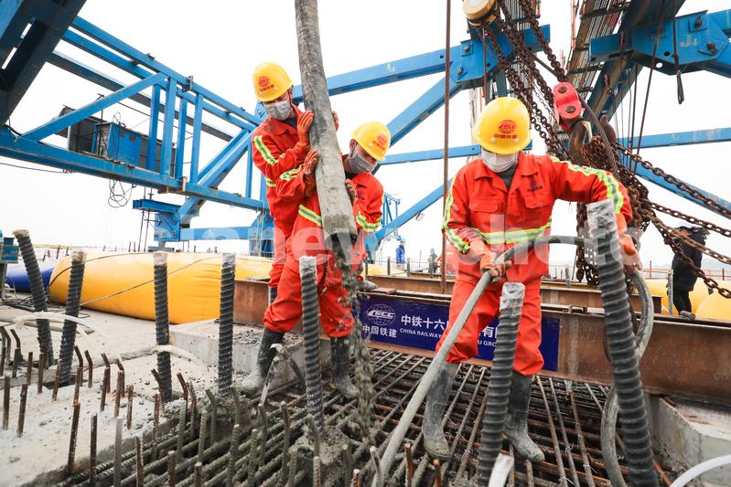 2020年2月28日,在浙江省杭州绕城西复线湖州段东苕溪大桥主桥合龙处,建筑工人们在作业。