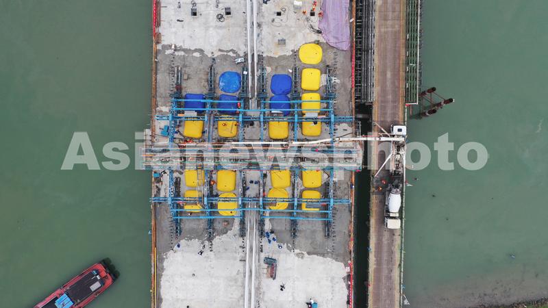2020年2月28日,在浙江省杭州绕城西复线湖州段东苕溪大桥主桥合龙处,建筑工人们在作业。