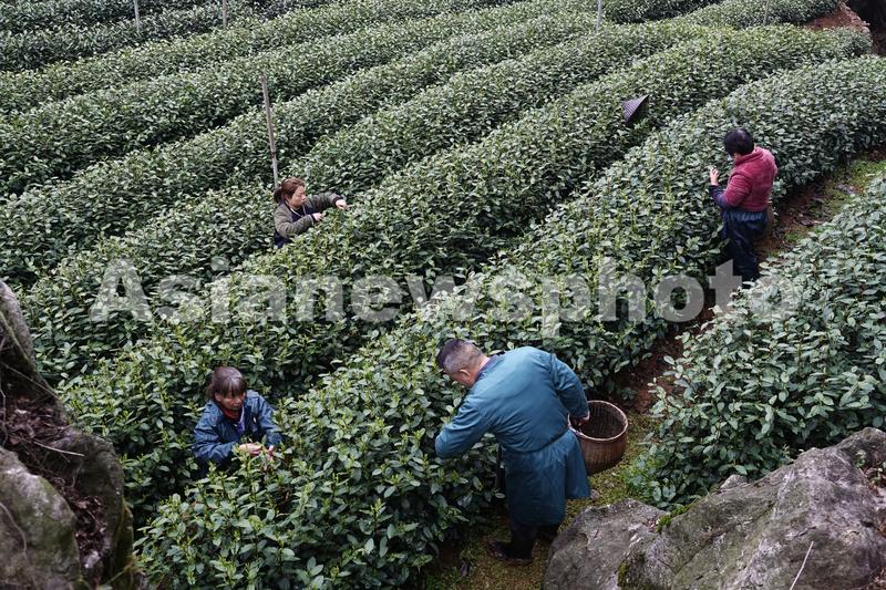 茶农正在茶园里少量开采西湖龙井春茶。