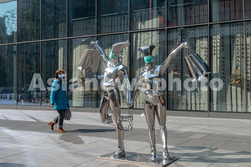 图片说明:2020年3月5日,上海陆家嘴商城路街边,一对不锈钢雕像被戴上了绿色的口罩。