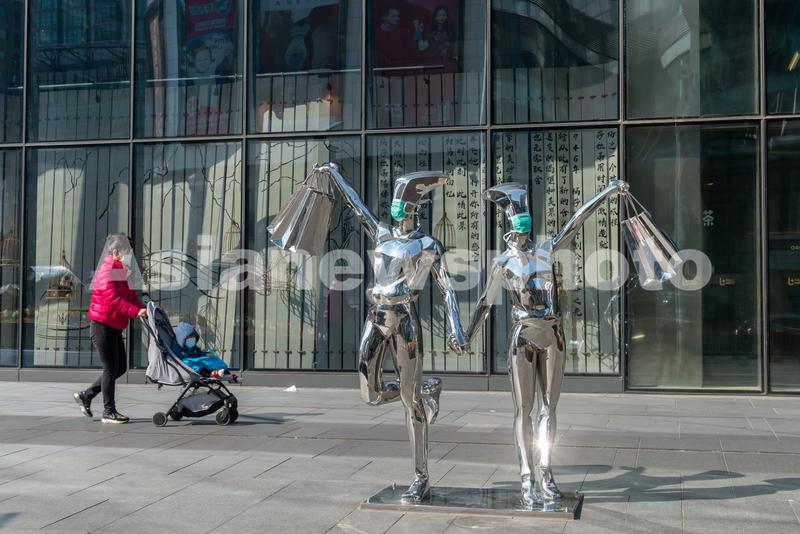 图片说明:2020年3月5日,上海陆家嘴商城路街边,一对不锈钢雕像被戴上了绿色的口罩。