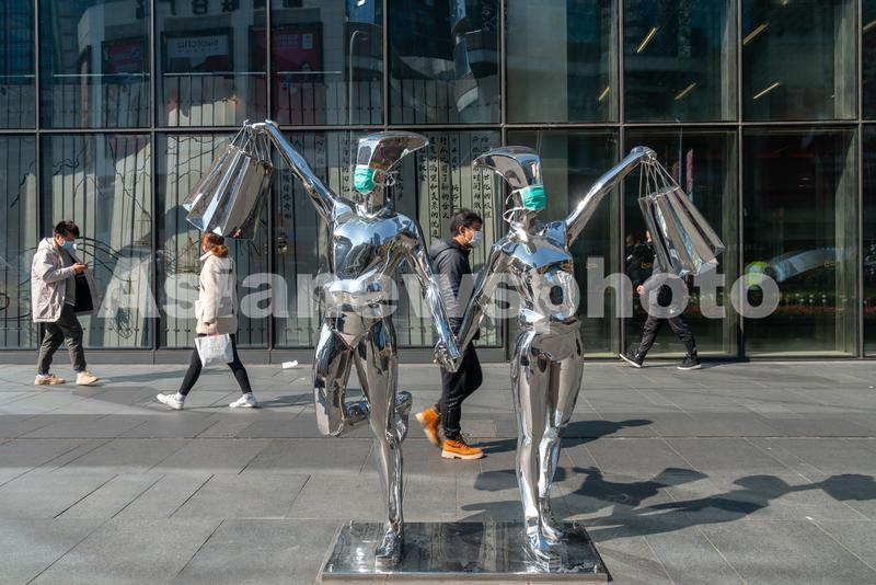 图片说明:2020年3月5日,上海陆家嘴商城路街边,一对不锈钢雕像被戴上了绿色的口罩。