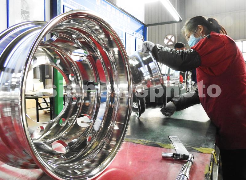 2020年3月9日,位于江苏省灌南经济开发区的江苏珀然轮毂有限公司生产车间,工人按照订单正在检验一批即将包装的铝轮毂。