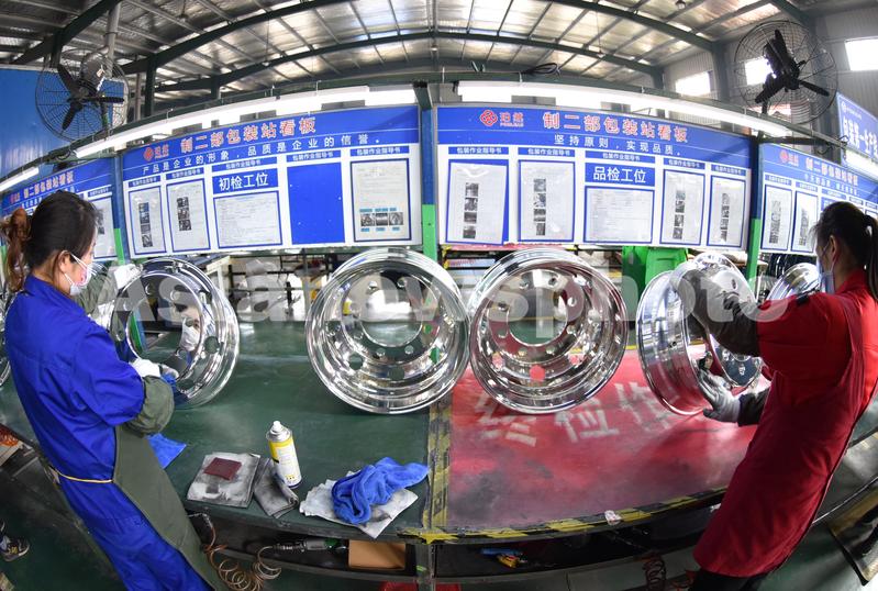 2020年3月9日,位于江苏省灌南经济开发区的江苏珀然轮毂有限公司生产车间,工人按照订单正在检验一批即将包装的铝轮毂。