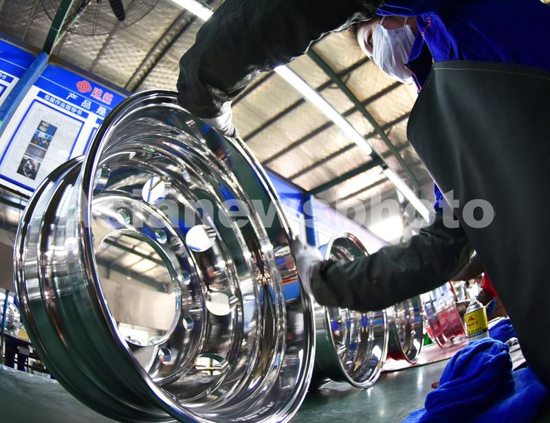 2020年3月9日,位于江苏省灌南经济开发区的江苏珀然轮毂有限公司生产车间,工人按照订单正在检验一批即将包装的铝轮毂。