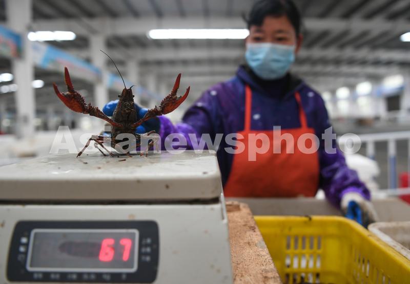 图片说明:2020年3月6日,湖北潜江小龙虾一处养殖基地,工人在称重收获的小龙虾。