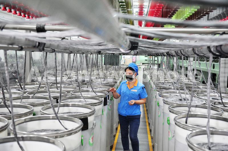 2020年3月17日,位于江苏省徐州市睢宁县经济开发区的江苏天虹智能纺织员工在生产线上工作。