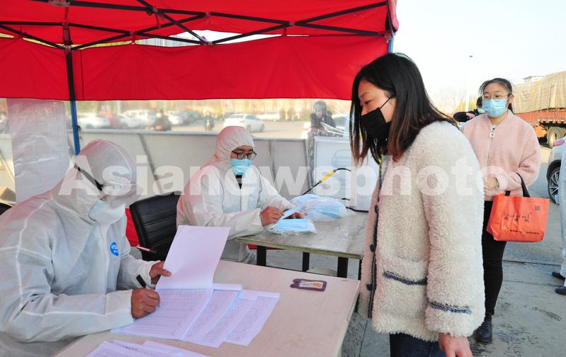 2020年3月17日,位于徐州市睢宁县宁江园区的江苏天虹时代纺织工作人员为进厂员工消毒、测量体温。