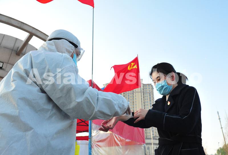 2020年3月17日,位于徐州市睢宁县宁江园区的江苏天虹时代纺织工作人员为进厂员工消毒、测量体温。