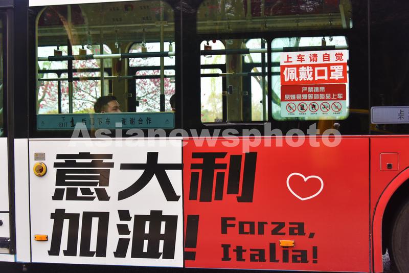 图片说明:为意大利加油打气,杭州1314路公交车全新亮相。