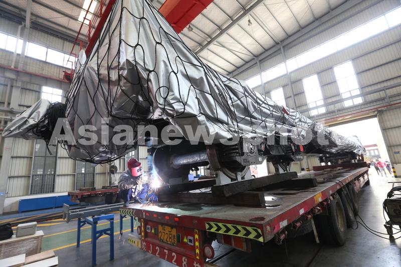 2020年3月30日,工人师傅在吊装pc-40型平车,这5台由3月11日复工的金鹰重工生产的pc-40型平车将从湖北襄阳发往新加坡,用于新加坡地铁建设和维护施工作业。该批平车将于4月1日到达上海军工港,4月15日到达新加坡。