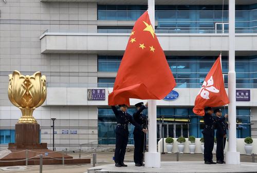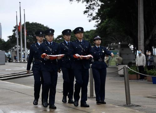 4月4日,香港金紫荆广场举行升旗仪式后下半旗,哀悼新冠肺炎疫情牺牲烈士和逝世同胞。