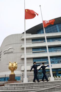 2020年4月4日,香港特别行政区金紫荆广场举行升旗仪式后下半旗,哀悼新冠肺炎疫情牺牲烈士和逝世同胞。据香港特区政府新闻网,香港特别行政区悬挂国旗和区旗的政府机构同日均下半旗(包含国旗和区旗)志哀。